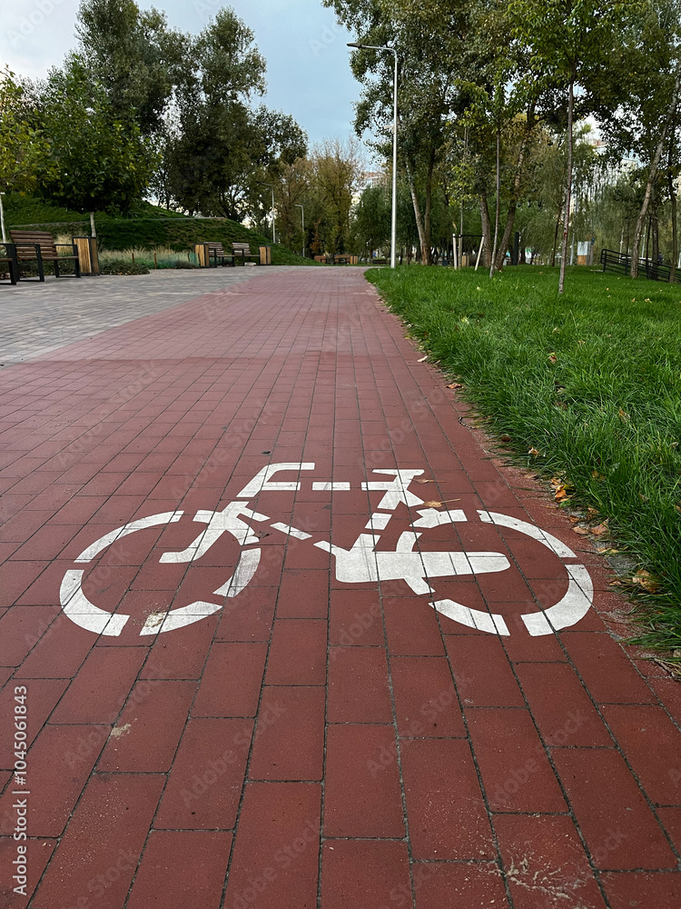 A bike path with a bike symbol on the ground. The bike symbol is white and black. The path is red and brick