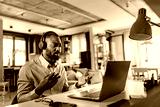 African-American businessman wearing headphones, engaged in a video call on his laptop in a modern home office. Focused and expressive during a virtual meeting.