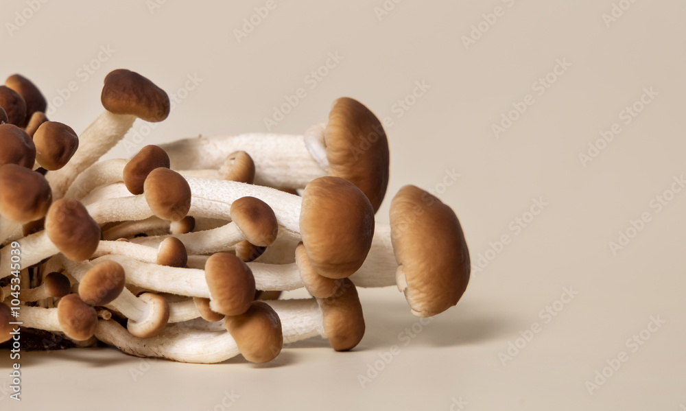 Fresh raw brown poplar mushrooms or velvet pioppini mushrooms on beige closeup