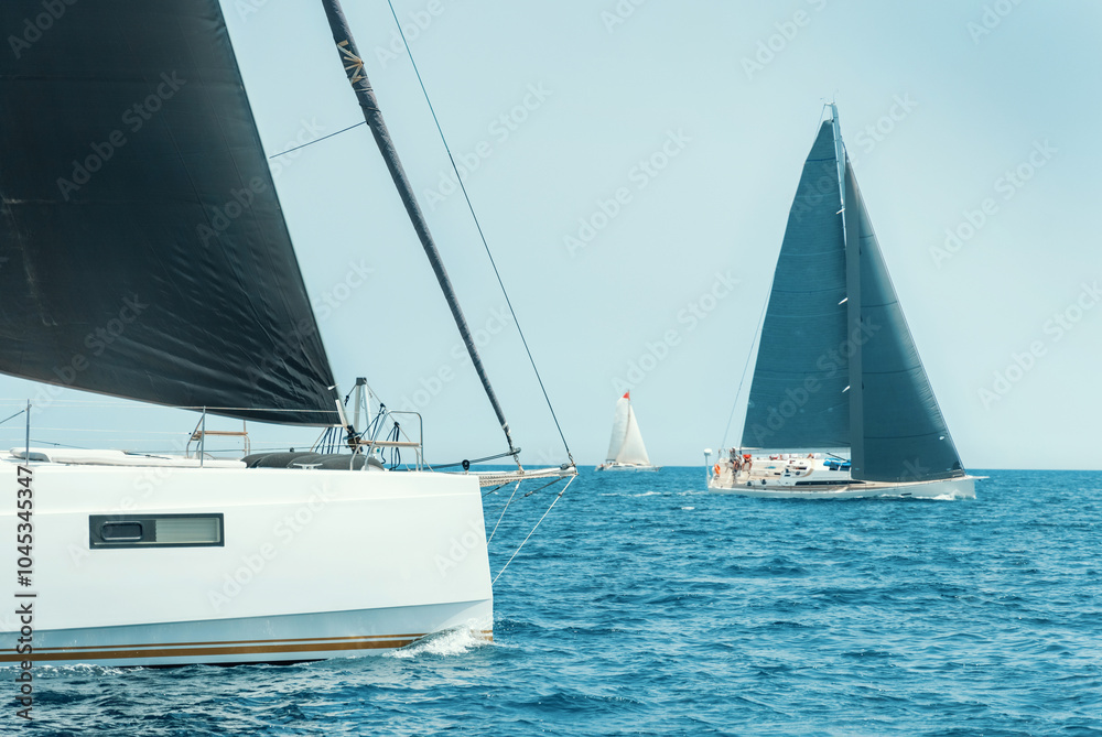 Sailboats races under blue cloudless sky. Essence of nautical spirit and teamwork