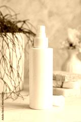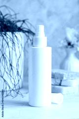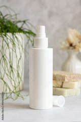 White blank spray cosmetic bottle on marble near green plant close up, mockup