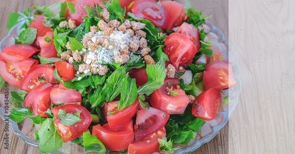 Fresh Salad with Tomatoes, Mint, and Mulberries with Copy Space
