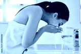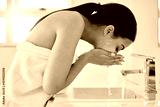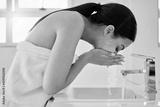 Bathroom, skincare and washing of face, woman and removal of mask, treatment and dermatology in home. Beauty, water drops and cleaning of oil in skin, hydration and person with facial for moisture