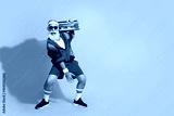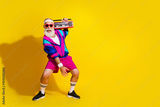 Full length photo banner of sportive cheerful old man dancing music boom box dressed stylish retro sportswear isolated on yellow background