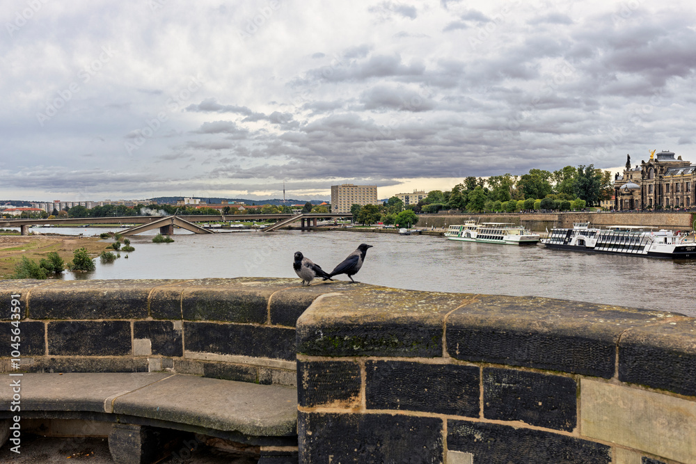 Atmospheric View from Abert Bridge Overlooking Elbe River, New Dresden Skyline, TV Tower, Cloudy Autumn Sky, and Foggy Crows Perched on Parapet in Foreground