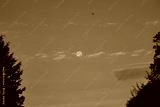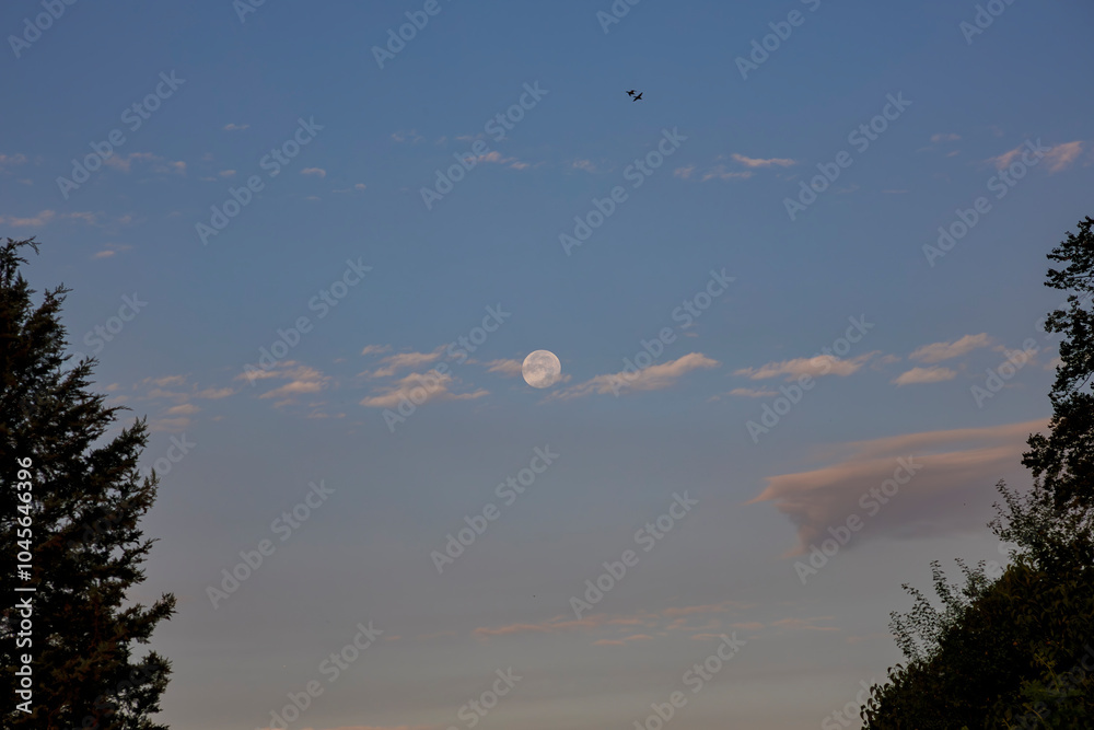 Breathtaking Evening Scene Featuring a Full Moon Illuminating the Sky Amongst Fluffy Clouds, with Two Wild Ducks Gracefully Flying By and Ample Free Space Below for Creative Use