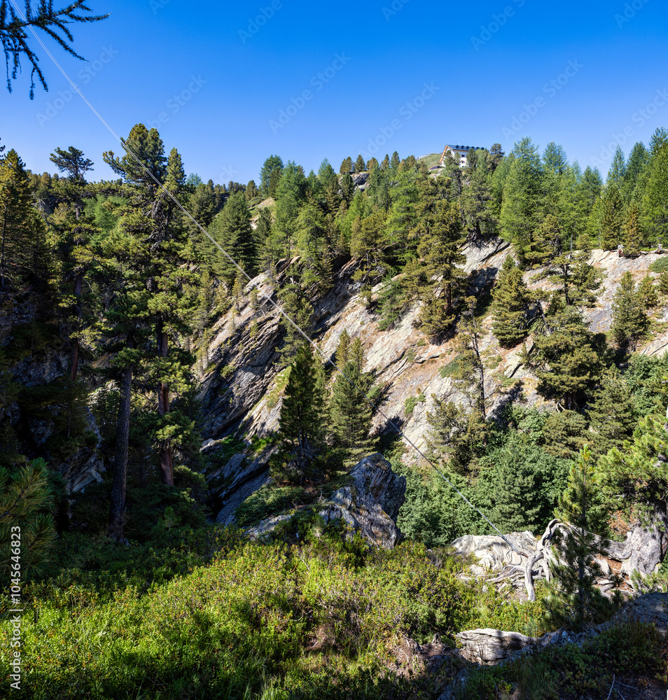 A Stunning White Mountain Hut Nestled on Steep, Rugged Rocks Covered with Lush Conifers, Enhanced by a Cable Car Rope Running Across the Scenic Landscape, Perfect for Adventure Seekers