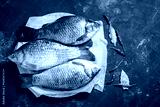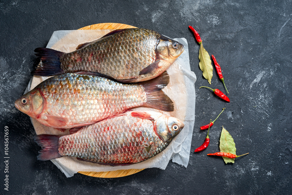 Fresh carp fish with bay leaf and chili over black background