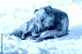 a brown dog licks a paw in the snow in winter