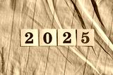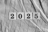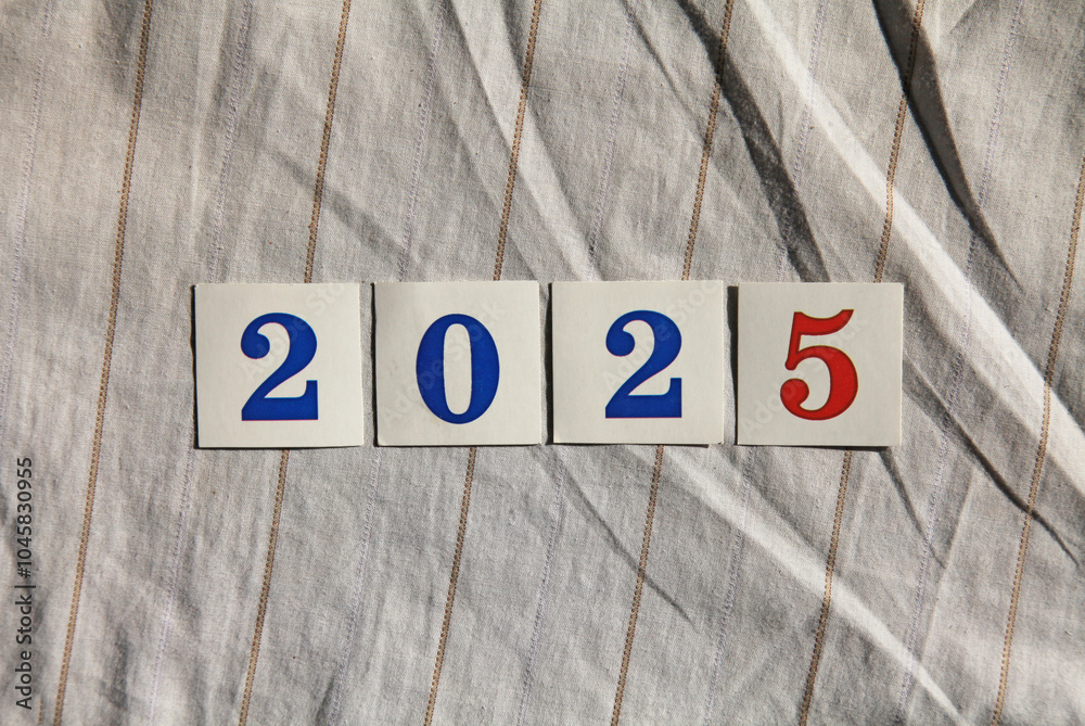 Numbers of 2025 year. Paper square numbers on the surface of wrinkled fabric, that means coming New Year Eve. Christmas, holidays, celebration concept. New Year of 2025, year of green wooden snake