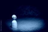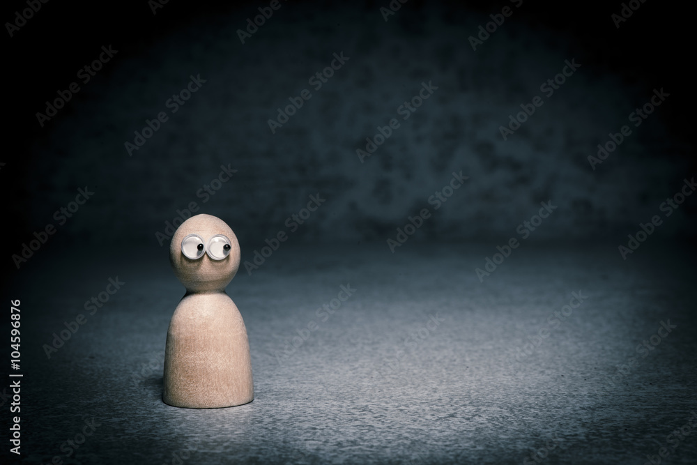 Symbol of loneliness and depression. Little figure alone in darkness looking nervous sideways. Concept of sadness, frustration and depressed emotion.