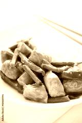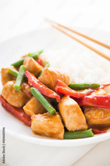 Spicy chicken with vegetables ( green beans and red pepper) and rice close up. Oriental food.