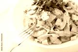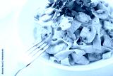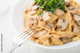 Pasta with creamy sauce, mushrooms and paprika close up.
