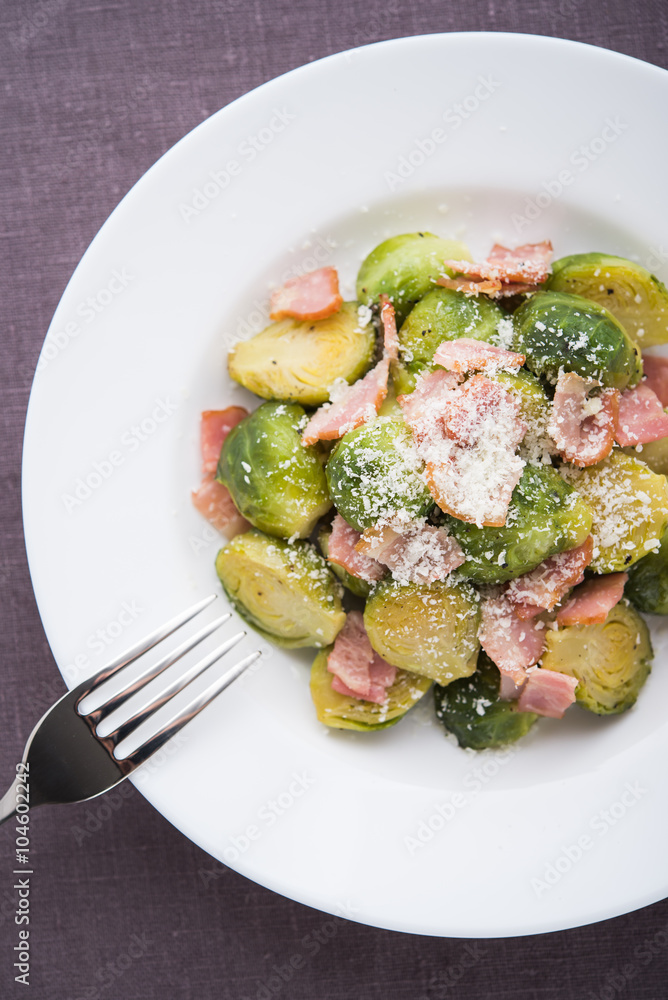 Brussels sprouts with bacon on dark background top view.