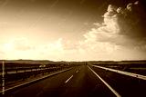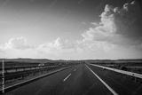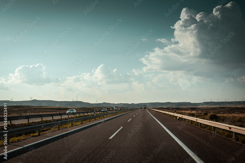 Straight empty paved road goes far over the horizon. Good road surface. Motorway, highway for traveling by car Autobahn on dessert and hills landscape