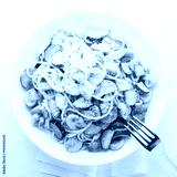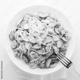 Pasta ( spaghetti ) with zucchini, mushrooms, creamy sauce and parmesan top view.