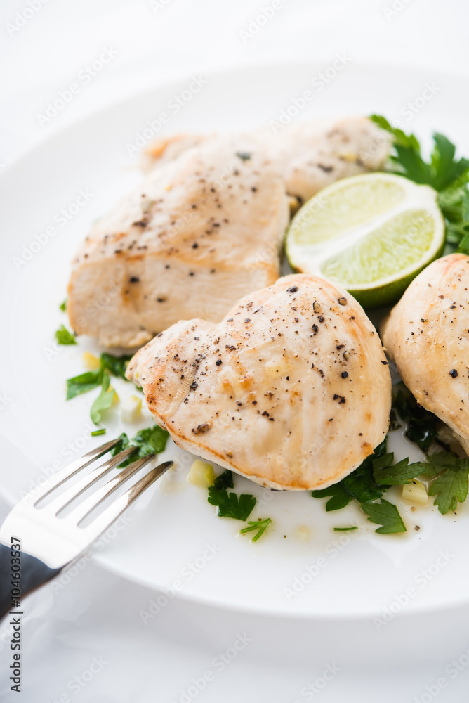 Chicken breasts with parsley and citrus on white background close up. Healthy food.