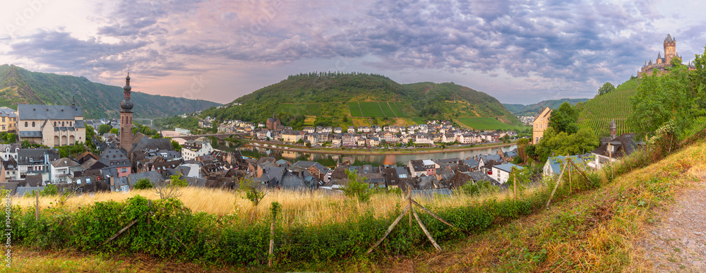Panoramic view of Cochem with Moselle river, traditional houses and Reichsburg castle, Germany