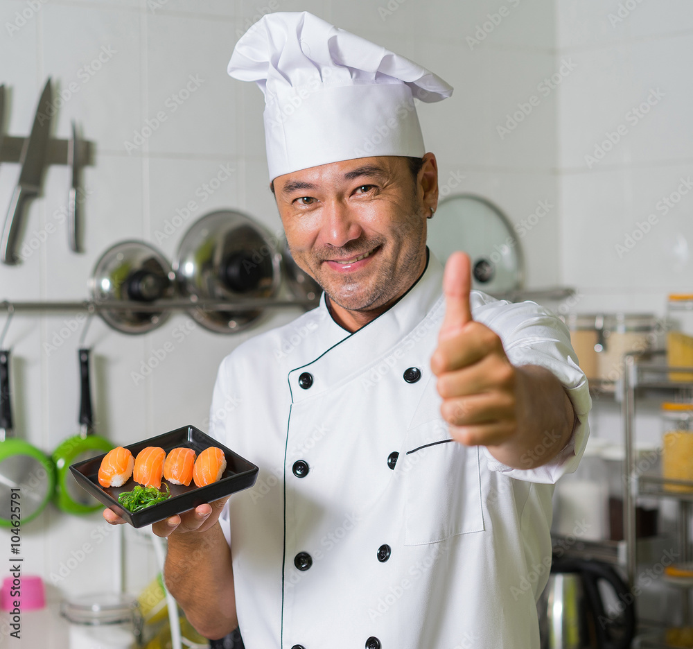 Asian chef sgowing plate with sushi and OK. Focus on sushi.