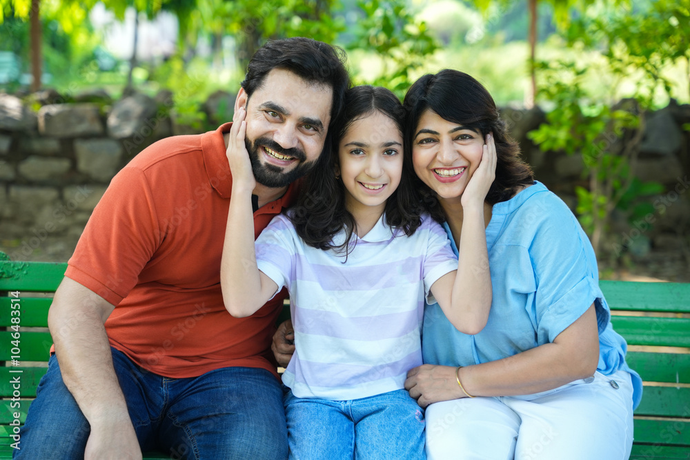 Young indian family at summer park together. Happy asian parents with daughter looking at camera. Togetherness. Love and care. Mom Dad Bonding Relationship
