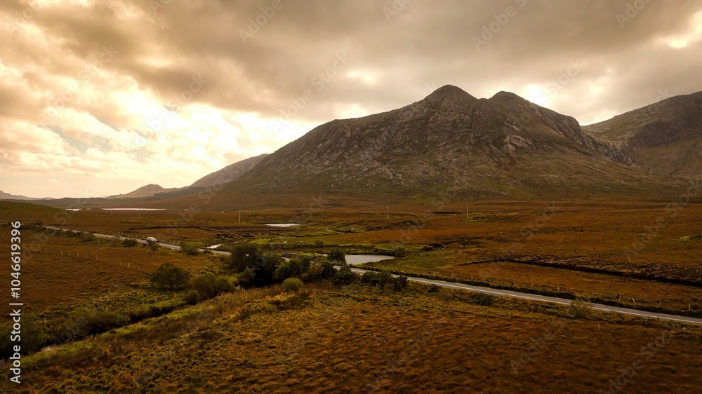 Connemara National Park in Ireland aerial view - A breathtaking and stunning mountain landscape sprawls under a clear blue sky above