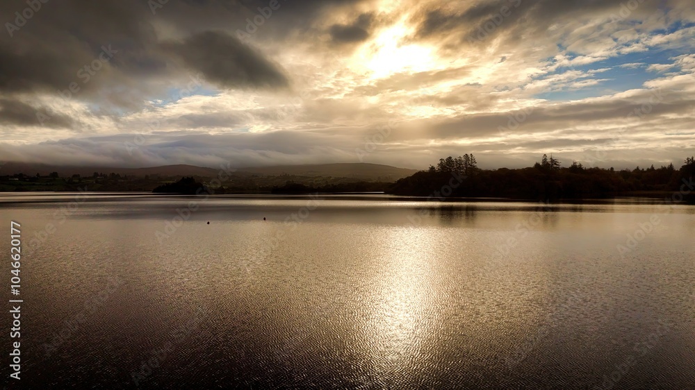 Lough Eske in Donegal Ireland - A Serene Sunset Over a Calm Lake with Peacefully Reflective Waters on the Horizon