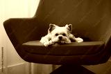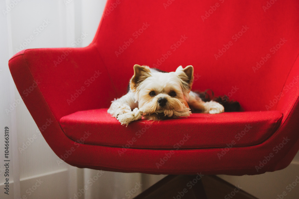 Cute funny purebred Yorkshire Terrier dog lies on a red chair in a modern interior and chews on a white pet toy. The funny puppy is looking straight ahead. Cute doggie, dogs, pup plays indoors at home