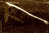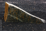 Stone Garden. Triangular stone with sharp edges and textured surface on a dark black ground. Zen gardens. Rough rock on racked black sand. Artwork.