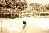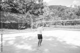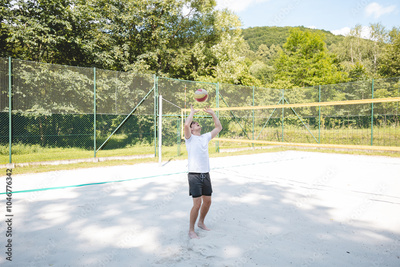 Young man tossing a volleyball into the air on a sandy court during a sunny day. The casual outdoor scene highlights fun, summer sports, and recreation in a natural setting