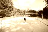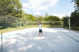 Young man tossing a volleyball into the air on a sandy court during a sunny day. The casual outdoor scene highlights fun, summer sports, and recreation in a natural setting