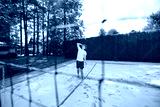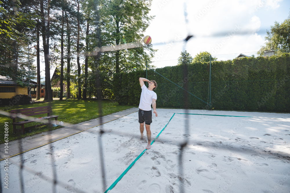 Young man tossing a volleyball into the air, preparing for a spike on a sand court. Captured from behind the net, showcasing a dynamic outdoor summer sports moment