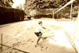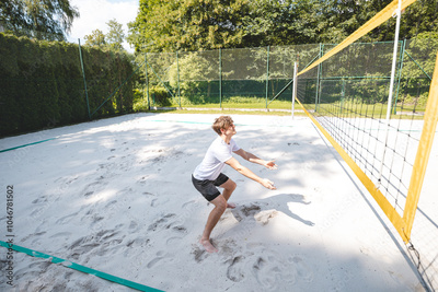 Young man in a ready position, preparing to receive or dig a volleyball on a sandy court. Capturing the intensity and focus of beach volleyball in an outdoor setting
