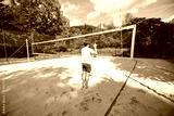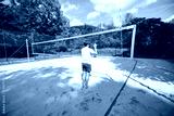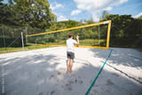 Back view of a young man jumping to block a volleyball at the net on a sand court. The outdoor scene captures the intensity of summer sports and beach volleyball