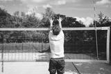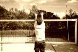 Volleyball player jumping to block a volleyball at the net on a sand court. The outdoor scene captures the intensity of summer sports and beach volleyball