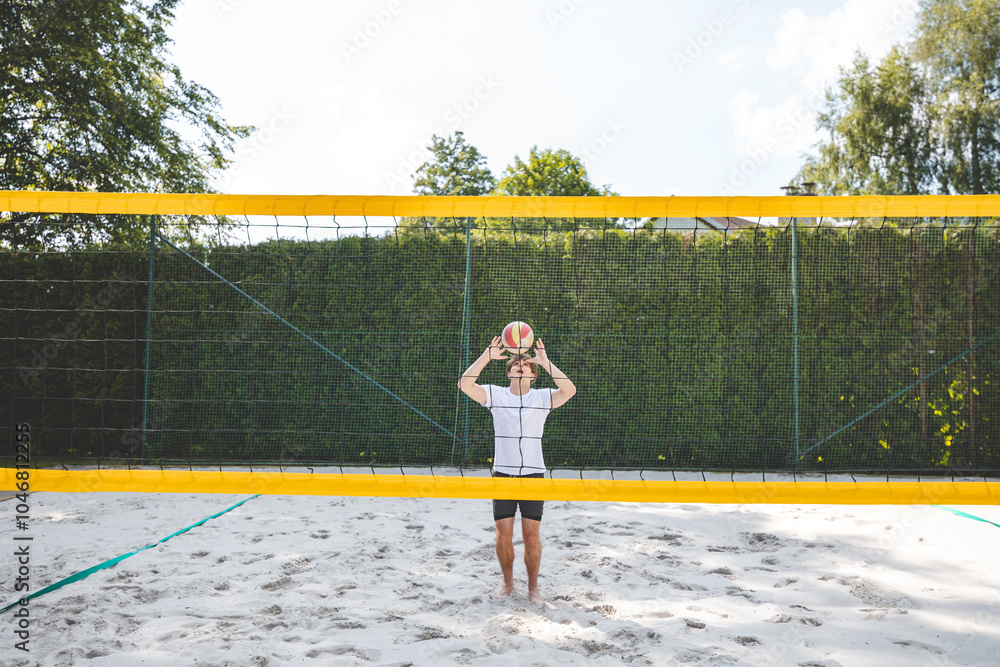 Volleyball player setting the ball on a sand court, preparing for the next play during an outdoor beach volleyball game. The action highlights control and precision in the game