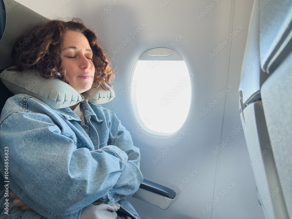 Rest on plane. Young woman napping sitting by porthole in business jet using neck pillow for travel. Passenger girl flying in plane. Girl sleeping in airplane going on trip vacation. Traveling girl