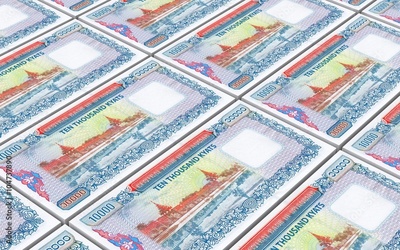 Myanmar kyat bills stacked background. Computer generated 3D photo rendering.