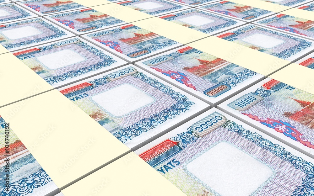 Myanmar kyat bills stacked background. Computer generated 3D photo rendering.