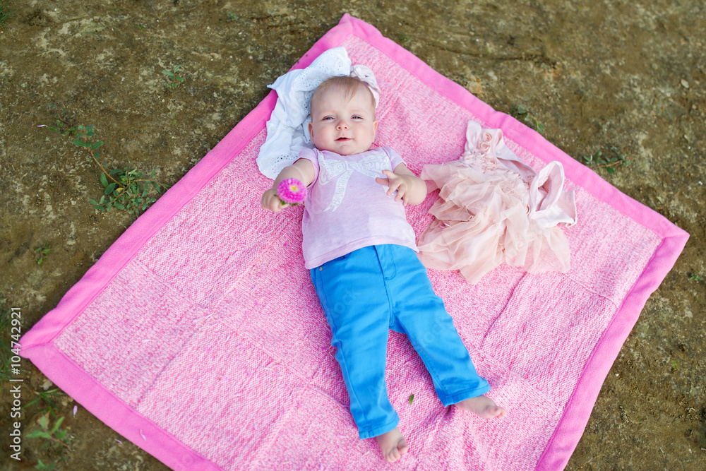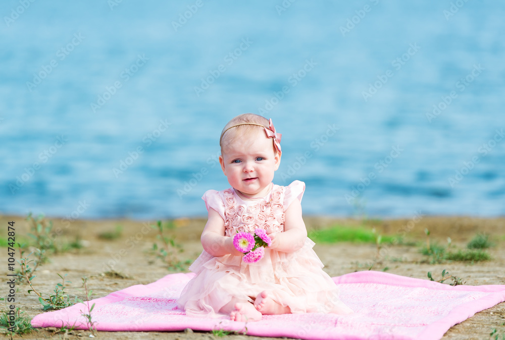 Baby in a pink dress sits on the river bank.