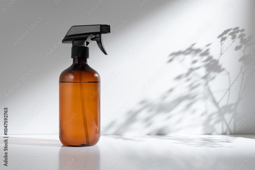 pray bottle on a light background with shadows of leaves