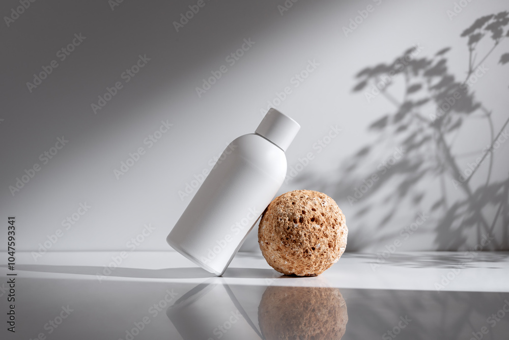 Minimalist white bottle on a light grey background with shadows of plant leaves
