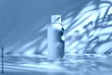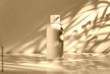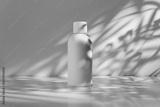 Minimalist white bottle on a light grey background with shadows of palm leaves
