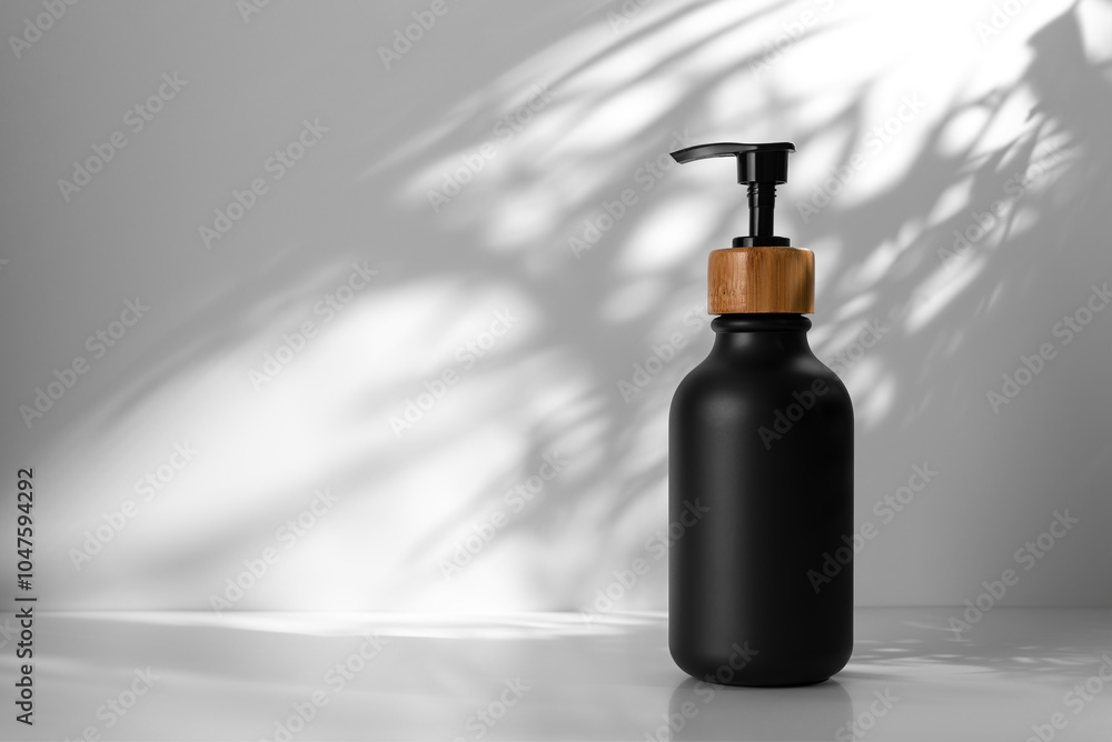 Minimalist black bottle on a light grey background with shadows of palm leaves