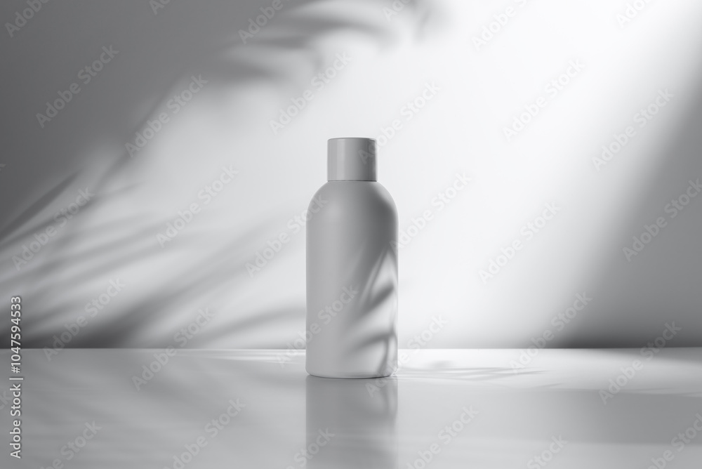 Minimalist white bottle on a light grey background with shadows of palm leaves