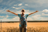 Happy joyful woman traveler with backpack standing in a wheat field on a sunny summer day feeling free