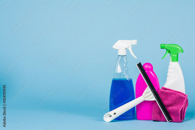 Cleaning concept - mixed detergents and cleaning accessories isolated on blue seamless background.