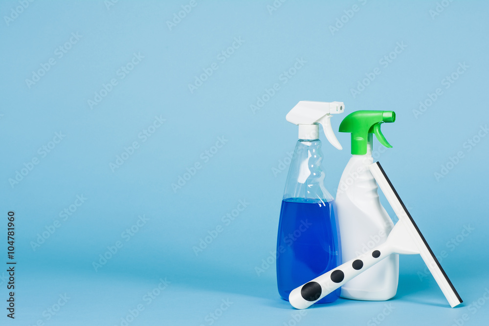 Cleaning concept - mixed detergents and cleaning accessories isolated on blue seamless background.