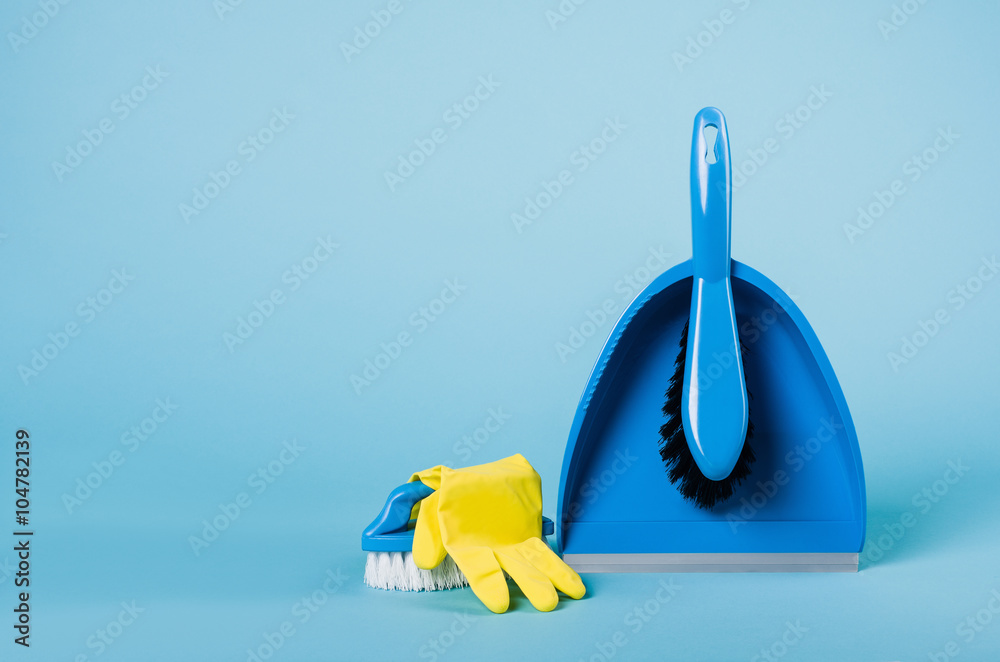 Cleaning concept - dustpan and sweeper on blue gradient backdrop