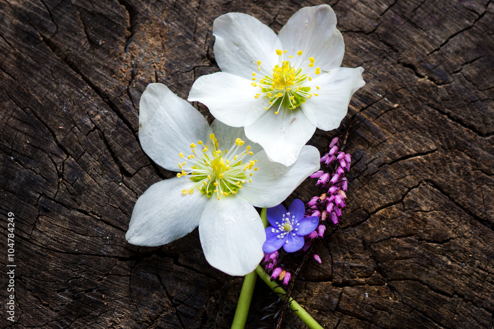 Flowers on rustic wooden background, copy space