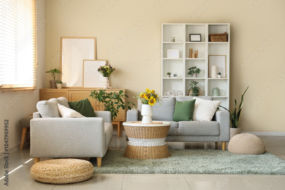 Comfortable sofas and wild flowers in vase on coffee table in interior of living room
